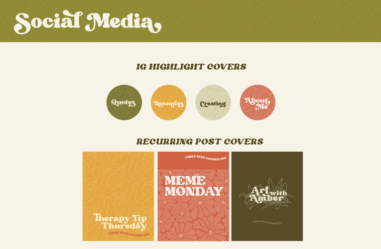 For Amber Reed Counseling, I developed a cohesive brand identity that reflects both Amber’s warmth and professionalism with a fun, vintage flair.